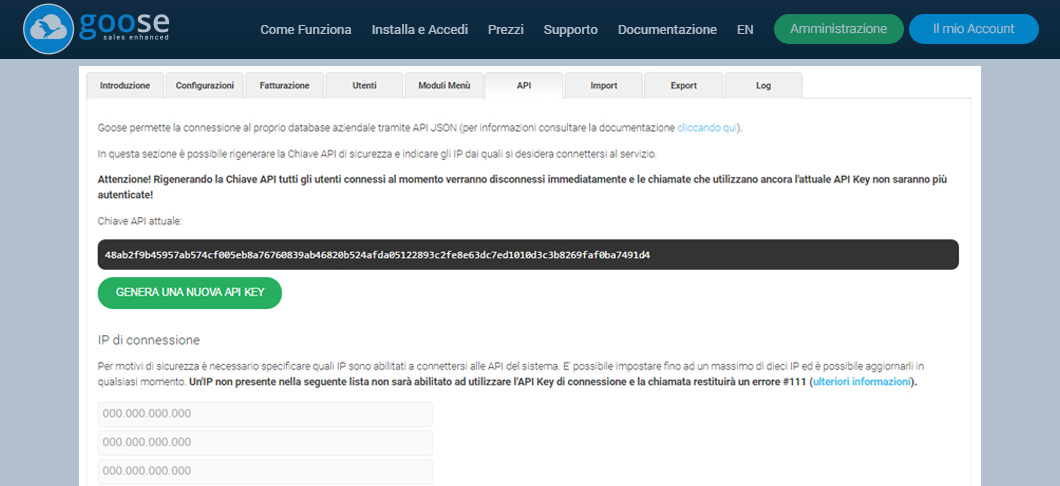 In questa pagina potete trovare la vostra Chiave API di sicurezza necessaria per qualsiasi chiamata, potete rigenerarla attraverso il tasto GENERA UNA NUOVA API KEY portando attenzione al fatto che la generazione di una nuova Chiave API implica il logout forzato di tutti i vostri utenti.