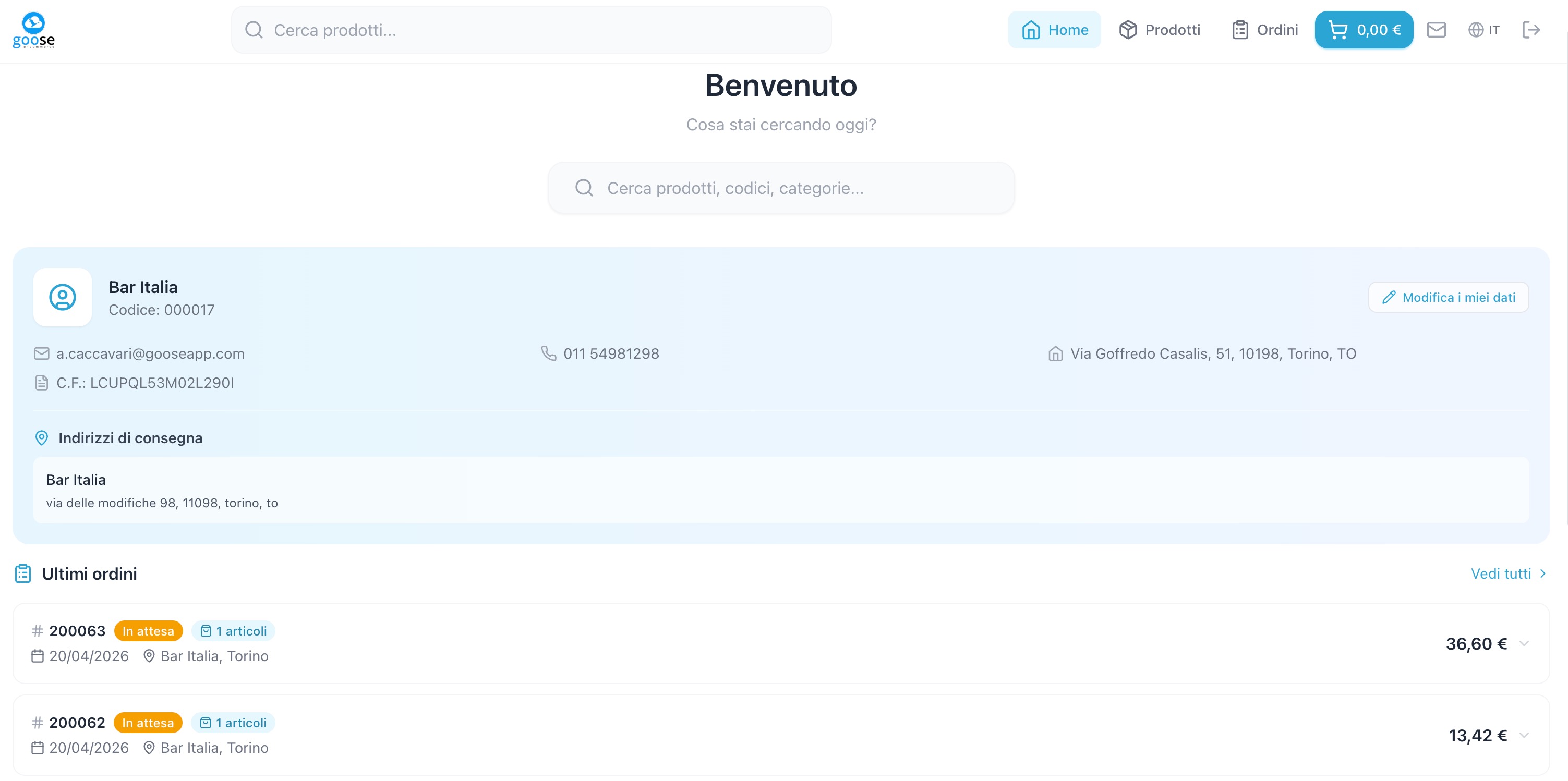 L' e-commerce di Goose consiste in un accesso con login su di un portale web in cui il tuo cliente finale potrà vedere il tuo Catalogo Prodotti ed effettuare Ordini in autonomia.